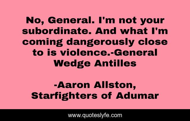 This page presents the quote "No, General. I'm not your subordinate. And what I'm coming dangerously close to is violence.-General Wedge Antilles". Author of this quote is Aaron Allston, Starfighters of Adumar. .