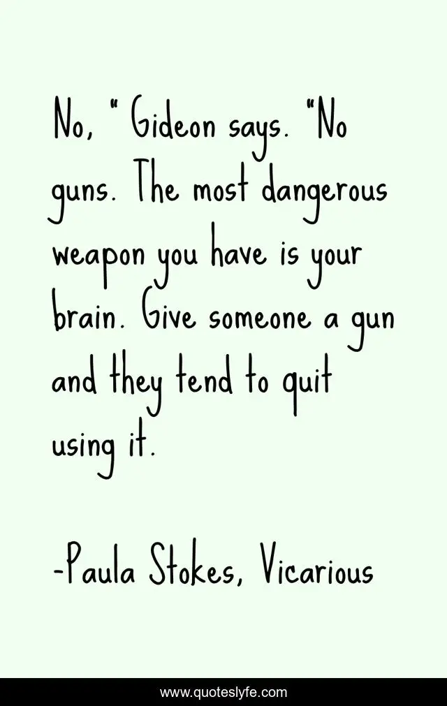 This page presents the quote "No, ” Gideon says. “No guns. The most dangerous weapon you have is your brain. Give someone a gun and they tend to quit using it.". Author of this quote is Paula Stokes, Vicarious. This quote is about weapons, brain, smarts, guns, strategy,.