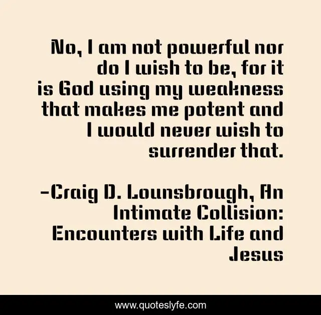 This page presents the quote "No, I am not powerful nor do I wish to be, for it is God using my weakness that makes me potent and I would never wish to surrender that.". Author of this quote is Craig D. Lounsbrough, An Intimate Collision: Encounters with Life and Jesus. This quote is about myself, useful, power, god, powerful, use, potent, weakness, weak,.