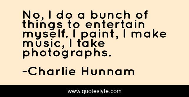 This page presents the quote "No, I do a bunch of things to entertain myself. I paint, I make music, I take photographs.". Author of this quote is Charlie Hunnam. This quote is about paint, myself, things,.
