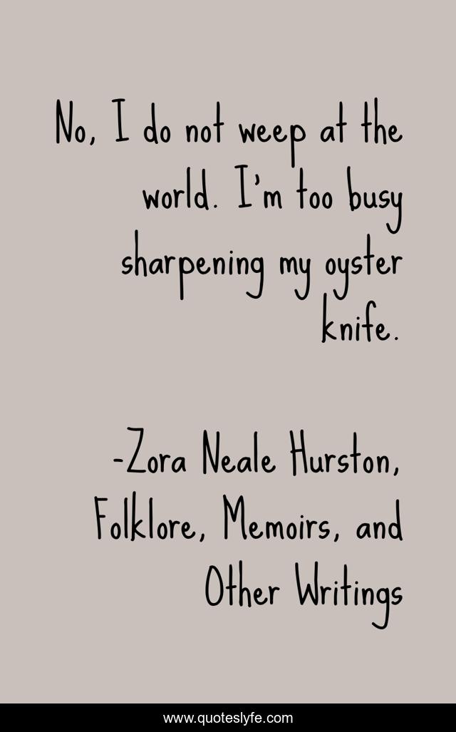 This page presents the quote "No, I do not weep at the world. I'm too busy sharpening my oyster knife.". Author of this quote is Zora Neale Hurston, Folklore, Memoirs, and Other Writings. .
