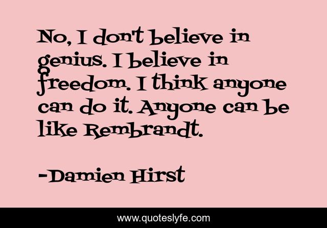 This page presents the quote "No, I don't believe in genius. I believe in freedom. I think anyone can do it. Anyone can be like Rembrandt.". Author of this quote is Damien Hirst. This quote is about i believe, genius, believe,.
