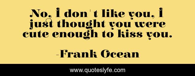 This page presents the quote "No, I don't like you, I just thought you were cute enough to kiss you.". Author of this quote is Frank Ocean. This quote is about r-and-b, funny, life-and-living, bogus, horomones, in-the-moment, comedy, hip-hop,.