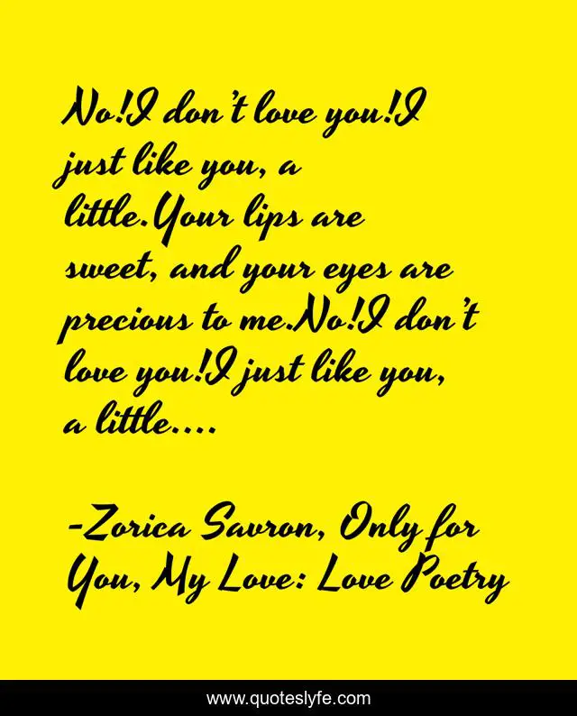 This page presents the quote "No!I don’t love you!I just like you, a little.Your lips are sweet, and your eyes are precious to me.No!I don’t love you!I just like you, a little....". Author of this quote is Zorica Savron, Only for You, My Love: Love Poetry. This quote is about lovers, love, love-poetry, love-poems, poetry, affection,.