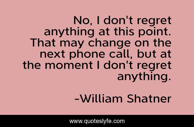 This page presents the quote "No, I don't regret anything at this point. That may change on the next phone call, but at the moment I don't regret anything.". Author of this quote is William Shatner. This quote is about moment, regret, point,.