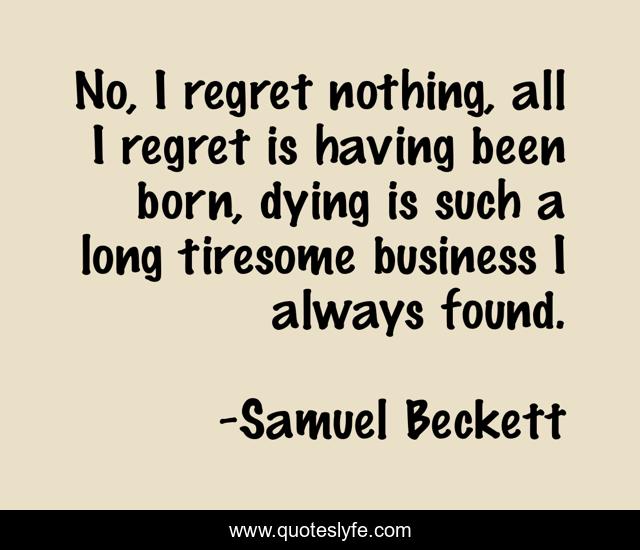 This page presents the quote "No, I regret nothing, all I regret is having been born, dying is such a long tiresome business I always found.". Author of this quote is Samuel Beckett. This quote is about life, death, regret,.