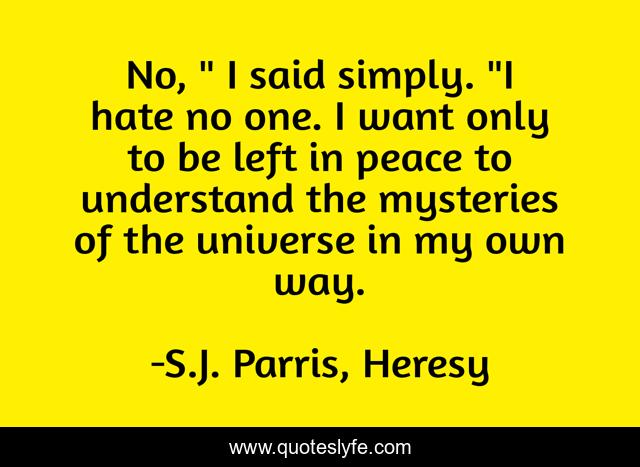 This page presents the quote "No, " I said simply. "I hate no one. I want only to be left in peace to understand the mysteries of the universe in my own way.". Author of this quote is S.J. Parris, Heresy. This quote is about religion, beliefs,.