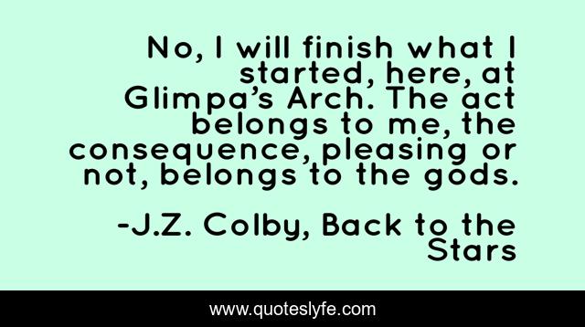 This page presents the quote "No, I will finish what I started, here, at Glimpa’s Arch. The act belongs to me, the consequence, pleasing or not, belongs to the gods.". Author of this quote is J.Z. Colby, Back to the Stars. This quote is about nebador, god, actions, consequences,.