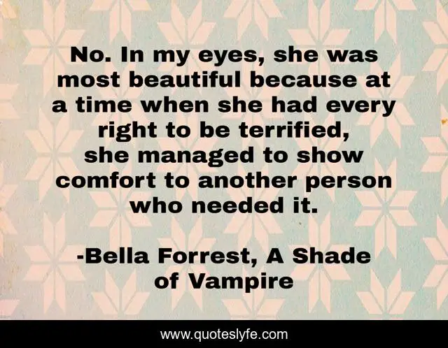 This page presents the quote "No. In my eyes, she was most beautiful because at a time when she had every right to be terrified, she managed to show comfort to another person who needed it.". Author of this quote is Bella Forrest, A Shade of Vampire. This quote is about enthusiasm, inspirational, inspiration,.