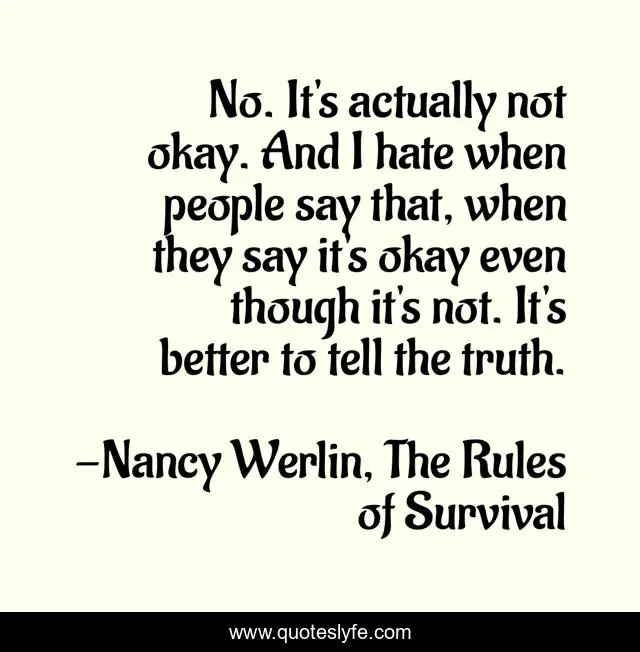 This page presents the quote "No. It's actually not okay. And I hate when people say that, when they say it's okay even though it's not. It's better to tell the truth.". Author of this quote is Nancy Werlin, The Rules of Survival. .