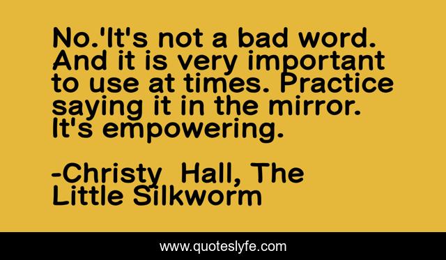 This page presents the quote "No.'It's not a bad word. And it is very important to use at times. Practice saying it in the mirror. It's empowering.". Author of this quote is Christy Hall, The Little Silkworm. This quote is about life, writers, life-experience, life-lessons, writing,.