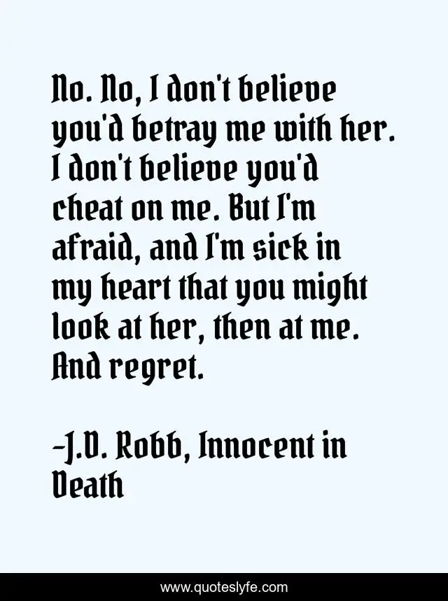 This page presents the quote "No. No, I don't believe you'd betray me with her. I don't believe you'd cheat on me. But I'm afraid, and I'm sick in my heart that you might look at her, then at me. And regret.". Author of this quote is J.D. Robb, Innocent in Death. This quote is about mystery, romance, fiction,.