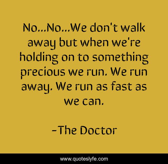 This page presents the quote "No...No...We don't walk away but when we're holding on to something precious we run. We run away. We run as fast as we can.". Author of this quote is The Doctor. This quote is about emotion, sentiment, morals, inspirational, enthusiasm, fear, precious,.