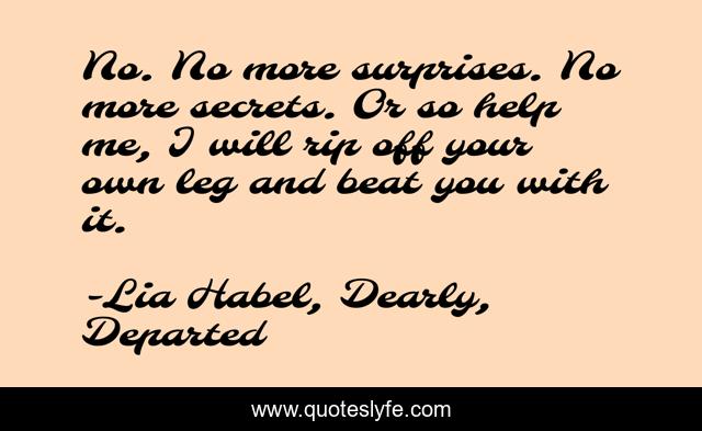This page presents the quote "No. No more surprises. No more secrets. Or so help me, I will rip off your own leg and beat you with it.". Author of this quote is Lia Habel, Dearly, Departed. This quote is about secrets, surprises, humor, zombie, threat,.