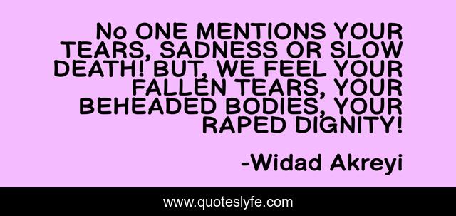 This page presents the quote "No ONE MENTIONS YOUR TEARS, SADNESS OR SLOW DEATH! BUT, WE FEEL YOUR FALLEN TEARS, YOUR BEHEADED BODIES, YOUR RAPED DIGNITY!". Author of this quote is Widad Akreyi. This quote is about widad-akrawi, ezidis, christians, human-rights, violence-against-women, peace, yazidis, civil-society, defend-international,.