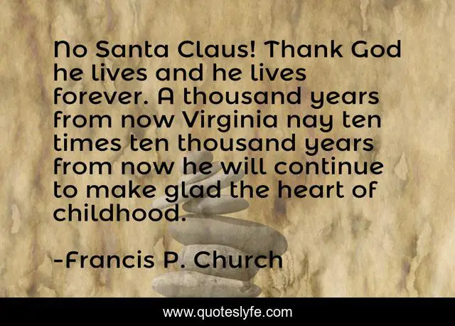 This page presents the quote "No Santa Claus! Thank God he lives and he lives forever. A thousand years from now Virginia nay ten times ten thousand years from now he will continue to make glad the heart of childhood.". Author of this quote is Francis P. Church. .