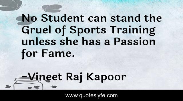 This page presents the quote "No Student can stand the Gruel of Sports Training unless she has a Passion for Fame.". Author of this quote is Vineet Raj Kapoor. This quote is about trainer, training, tough, gruel, money, athlete, burn, sports, passion,.