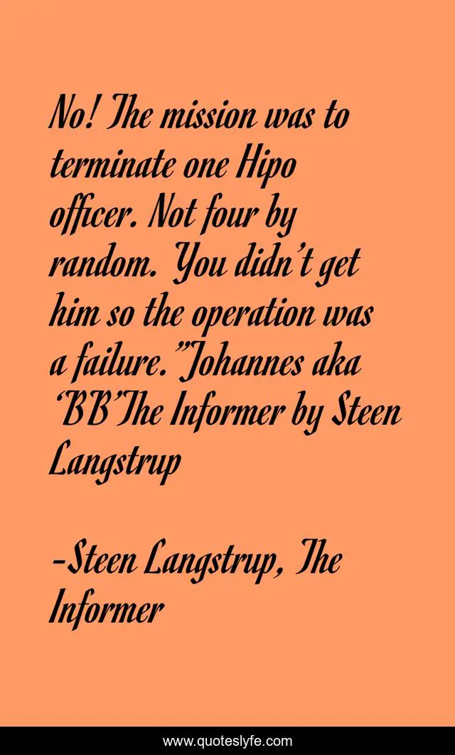 This page presents the quote "No! The mission was to terminate one Hipo officer. Not four by random. You didn’t get him so the operation was a failure.”Johannes aka ‘BB’The Informer by Steen Langstrup". Author of this quote is Steen Langstrup, The Informer. This quote is about scandinavian-mysteries, hipo, mission, noir-fiction,.