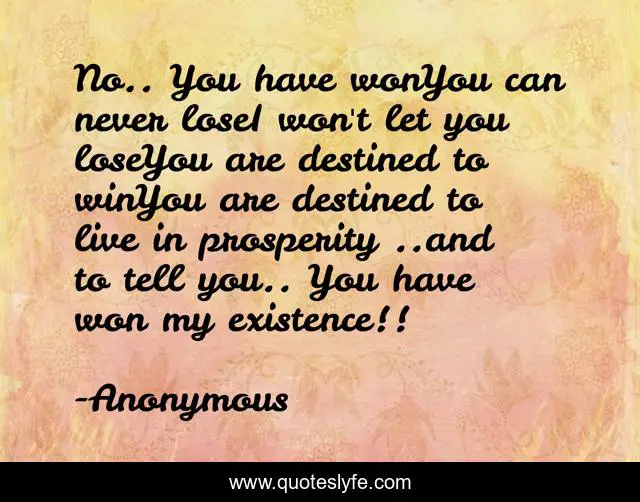 This page presents the quote "No.. You have wonYou can never loseI won't let you loseYou are destined to winYou are destined to live in prosperity ..and to tell you.. You have won my existence!!". Author of this quote is Anonymous. This quote is about loss, play, love, destiny, existence, affection,.