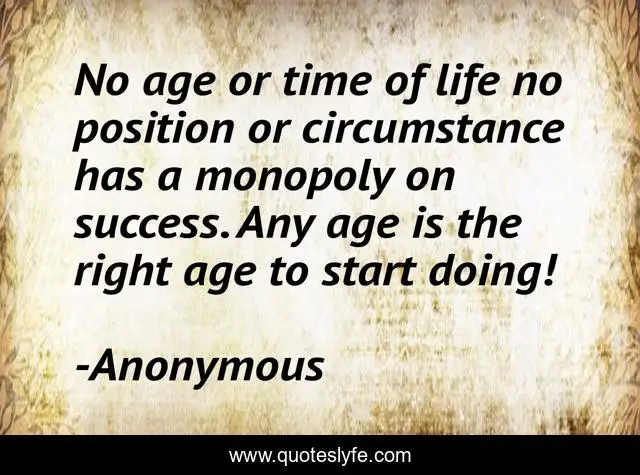 This page presents the quote "No age or time of life no position or circumstance has a monopoly on success. Any age is the right age to start doing!". Author of this quote is Anonymous. This quote is about going, getting,.