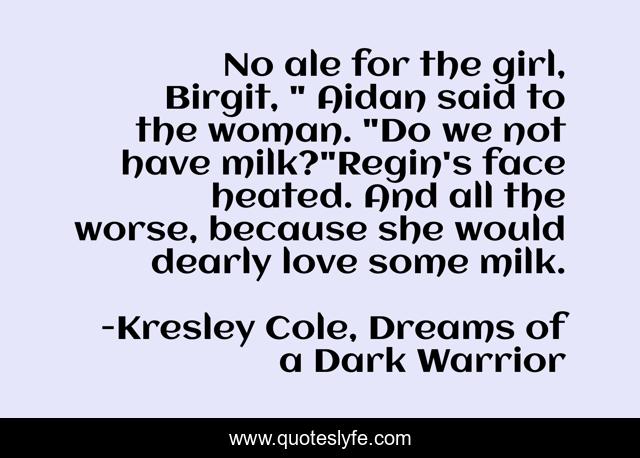 This page presents the quote "No ale for the girl, Birgit, " Aidan said to the woman. "Do we not have milk?"Regin's face heated. And all the worse, because she would dearly love some milk.". Author of this quote is Kresley Cole, Dreams of a Dark Warrior. This quote is about aidan-the-fierce, valkyrie, kresley-cole, regin-the-radiant, dreams-of-a-dark-warrior, lore, berserker, immortals-after-dark, paranormal-romance,.