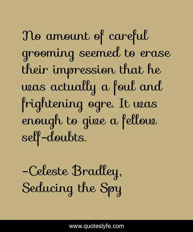 This page presents the quote "No amount of careful grooming seemed to erase their impression that he was actually a foul and frightening ogre. It was enough to give a fellow self-doubts.". Author of this quote is Celeste Bradley, Seducing the Spy. This quote is about regency-romance, romance, humor, royal-four, spy,.