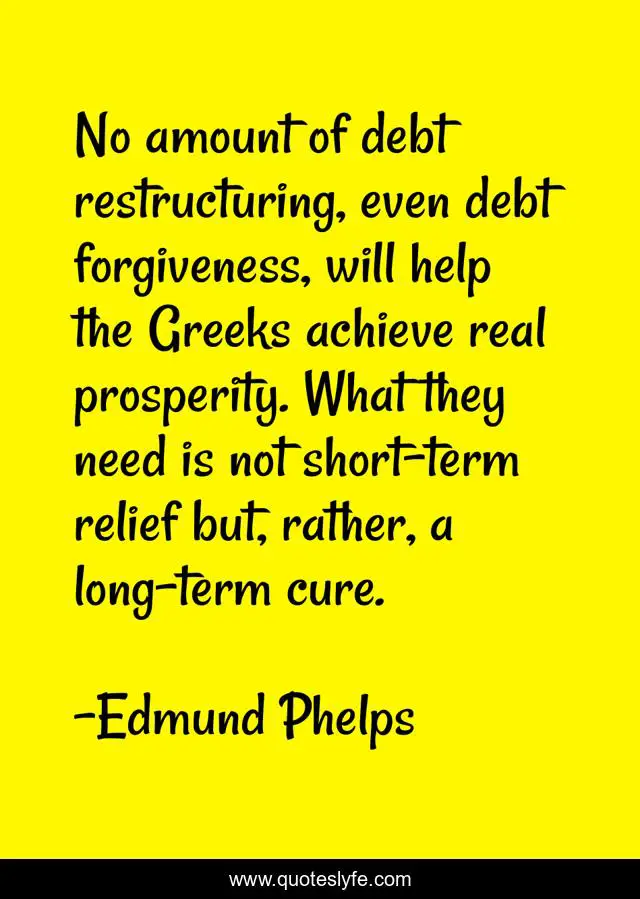 This page presents the quote "No amount of debt restructuring, even debt forgiveness, will help the Greeks achieve real prosperity. What they need is not short-term relief but, rather, a long-term cure.". Author of this quote is Edmund Phelps. This quote is about debt, help, achieve,.