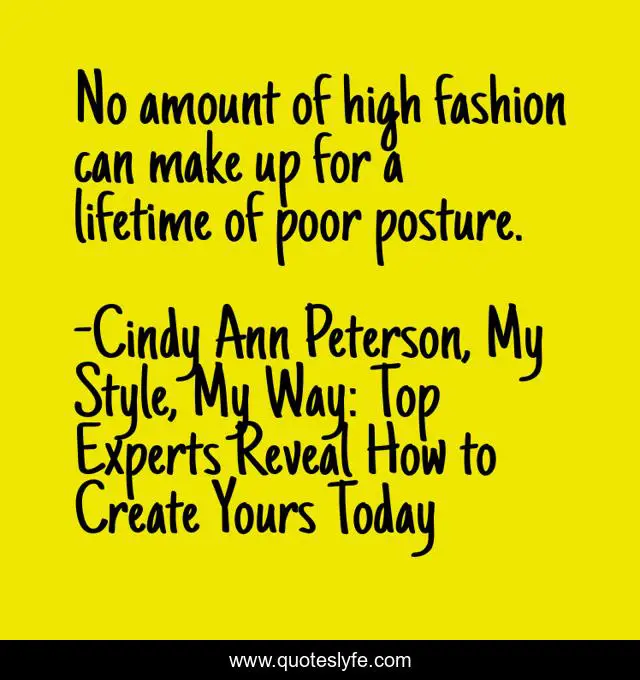 This page presents the quote "No amount of high fashion can make up for a lifetime of poor posture.". Author of this quote is Cindy Ann Peterson, My Style, My Way: Top Experts Reveal How to Create Yours Today. This quote is about fashion, organized, attitude, lifetime, style, enthusiasm, non-verbal-communication, cindy-ann-peterson, beauty,.