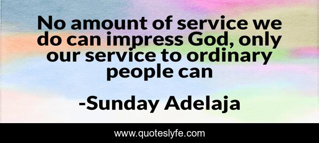 This page presents the quote "No amount of service we do can impress God, only our service to ordinary people can". Author of this quote is Sunday Adelaja. This quote is about love, people, money, principles, employment, worship, celebrating-people, destiny, service,.