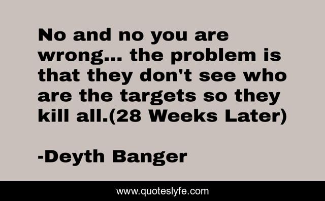 This page presents the quote "No and no you are wrong... the problem is that they don't see who are the targets so they kill all.(28 Weeks Later)". Author of this quote is Deyth Banger. This quote is about wrong, zombies, no,.