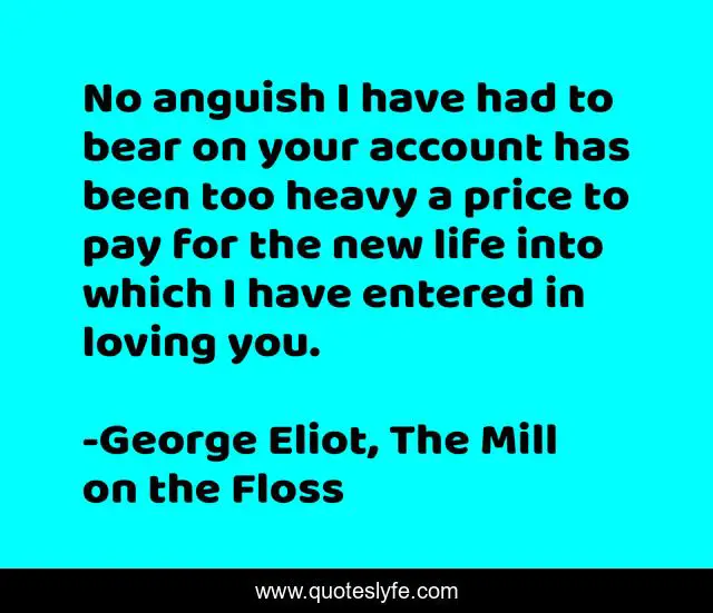 This page presents the quote "No anguish I have had to bear on your account has been too heavy a price to pay for the new life into which I have entered in loving you.". Author of this quote is George Eliot, The Mill on the Floss. This quote is about love, pain, affection,.