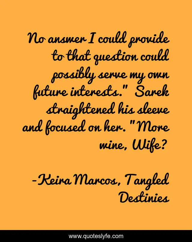 "Keira Marcos, Tangled Destinies Quotes." Quoteslyfe.com, 2025. Mon. 08 Dec. 2025. <https://www.quoteslyfe.com/quote/No-answer-I-could-provide-to-that-55976>.