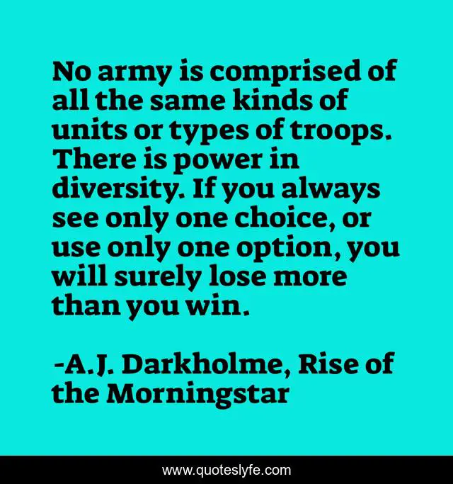 This page presents the quote "No army is comprised of all the same kinds of units or types of troops. There is power in diversity. If you always see only one choice, or use only one option, you will surely lose more than you win.". Author of this quote is A.J. Darkholme, Rise of the Morningstar. This quote is about united, diversity, troops, power, army, choice, acceptance, people, focus,.