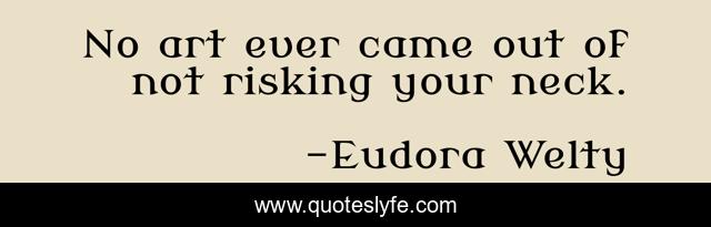 This page presents the quote "No art ever came out of not risking your neck.". Author of this quote is Eudora Welty. This quote is about writing-life, writing-process-writing-advice, writing,.