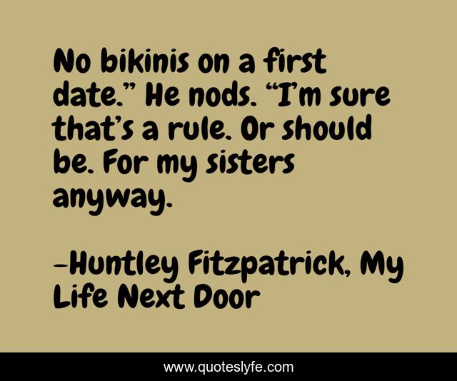 This page presents the quote "No bikinis on a first date.” He nods. “I’m sure that’s a rule. Or should be. For my sisters anyway.". Author of this quote is Huntley Fitzpatrick, My Life Next Door. This quote is about funny, humour, young-adult-romance, romance, comedy, young-adult,.