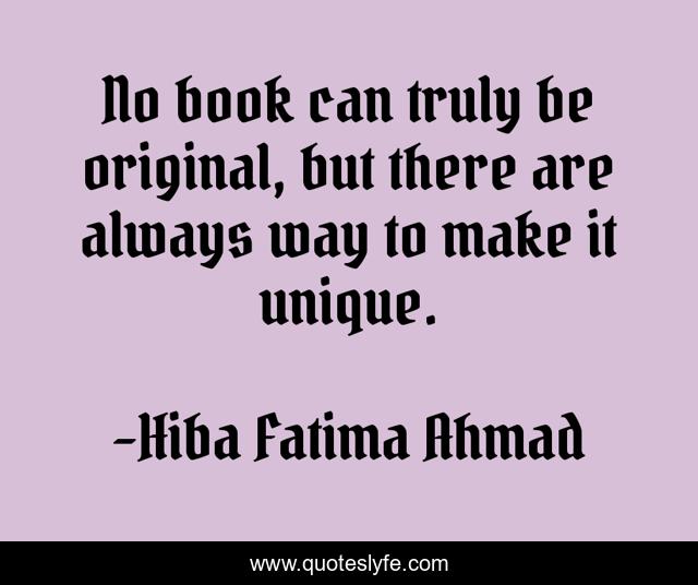 This page presents the quote "No book can truly be original, but there are always way to make it unique.". Author of this quote is Hiba Fatima Ahmad. This quote is about unique, book, original,.