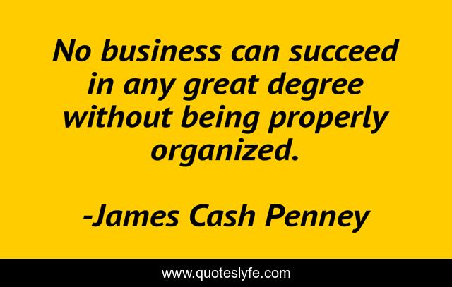 This page presents the quote "No business can succeed in any great degree without being properly organized.". Author of this quote is James Cash Penney. This quote is about great, succeed, without,.