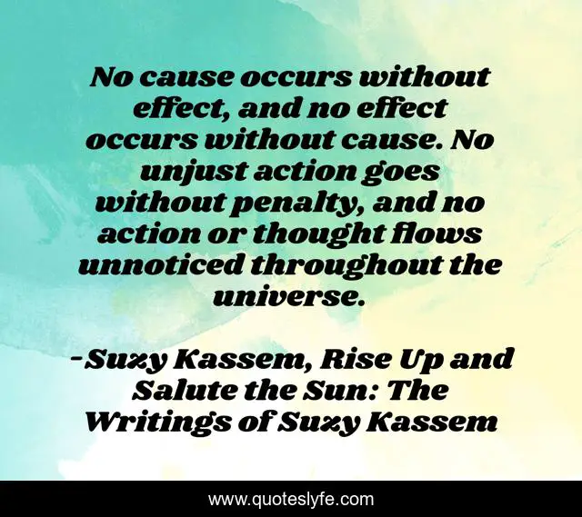 This page presents the quote "No cause occurs without effect, and no effect occurs without cause. No unjust action goes without penalty, and no action or thought flows unnoticed throughout the universe.". Author of this quote is Suzy Kassem, Rise Up and Salute the Sun: The Writings of Suzy Kassem. This quote is about penalty, word, justice, universe, effect, thought, unjust, action, cause,.
