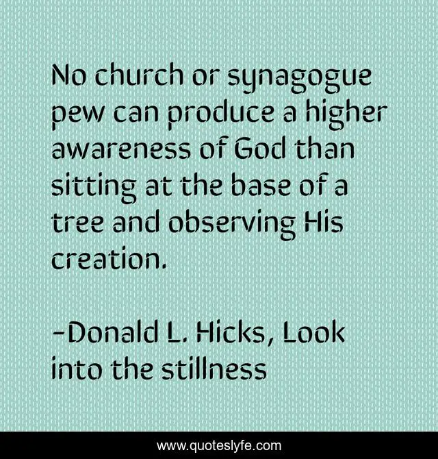 This page presents the quote "No church or synagogue pew can produce a higher awareness of God than sitting at the base of a tree and observing His creation.". Author of this quote is Donald L. Hicks, Look into the stillness. This quote is about spirituality, meditation, church, nature,.
