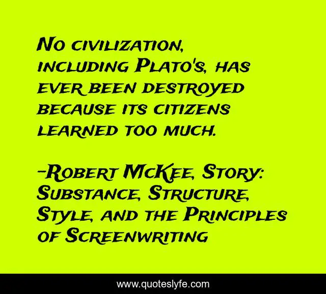 This page presents the quote "No civilization, including Plato's, has ever been destroyed because its citizens learned too much.". Author of this quote is Robert McKee, Story: Substance, Structure, Style, and the Principles of Screenwriting. This quote is about citizens, knowledge, plato, civilization, learning, destruction,.