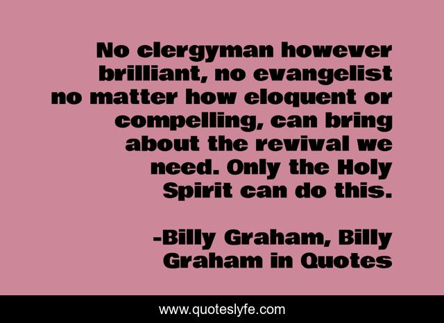 This page presents the quote "No clergyman however brilliant, no evangelist no matter how eloquent or compelling, can bring about the revival we need. Only the Holy Spirit can do this.". Author of this quote is Billy Graham, Billy Graham in Quotes. This quote is about evangelism, billy-graham,.