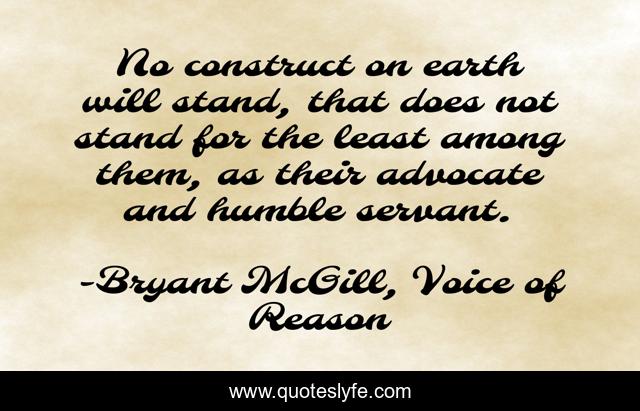 This page presents the quote "No construct on earth will stand, that does not stand for the least among them, as their advocate and humble servant.". Author of this quote is Bryant McGill, Voice of Reason. This quote is about inspiring, trust, humble,.