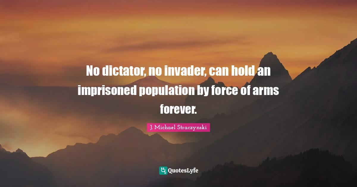 This page presents the quote "No dictator, no invader, can hold an imprisoned population by force of arms forever.". Author of this quote is J. Michael Straczynski. This quote is about forever, dictator, arms, force, population,.