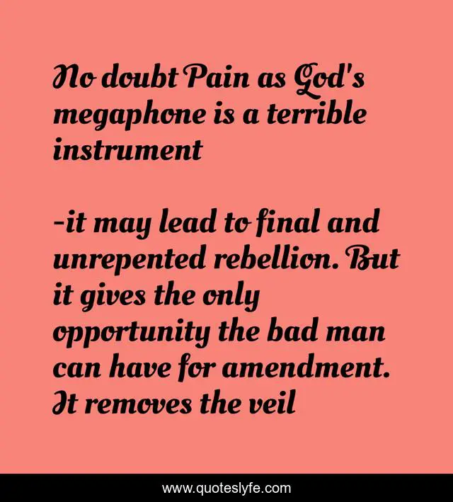 This page presents the quote "No doubt Pain as God's megaphone is a terrible instrument". Author of this quote is it may lead to final and unrepented rebellion. But it gives the only opportunity the bad man can have for amendment. It removes the veil. .