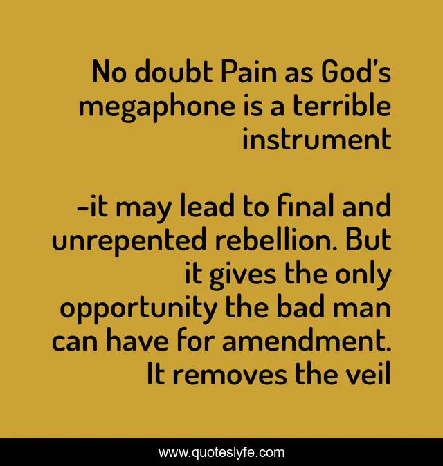 This page presents the quote "No doubt Pain as God’s megaphone is a terrible instrument". Author of this quote is it may lead to final and unrepented rebellion. But it gives the only opportunity the bad man can have for amendment. It removes the veil. .