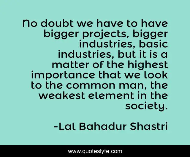 This page presents the quote "No doubt we have to have bigger projects, bigger industries, basic industries, but it is a matter of the highest importance that we look to the common man, the weakest element in the society.". Author of this quote is Lal Bahadur Shastri. This quote is about doubt, look, man,.