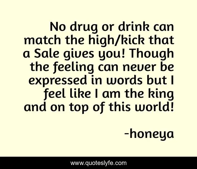 This page presents the quote "No drug or drink can match the high/kick that a Sale gives you! Though the feeling can never be expressed in words but I feel like I am the king and on top of this world!". Author of this quote is honeya. This quote is about sell, selling, sales-advice, sale, drug, sales, high, substance, kick,.