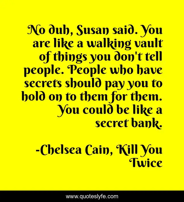 This page presents the quote "No duh, Susan said. You are like a walking vault of things you don't tell people. People who have secrets should pay you to hold on to them for them. You could be like a secret bank.". Author of this quote is Chelsea Cain, Kill You Twice. .