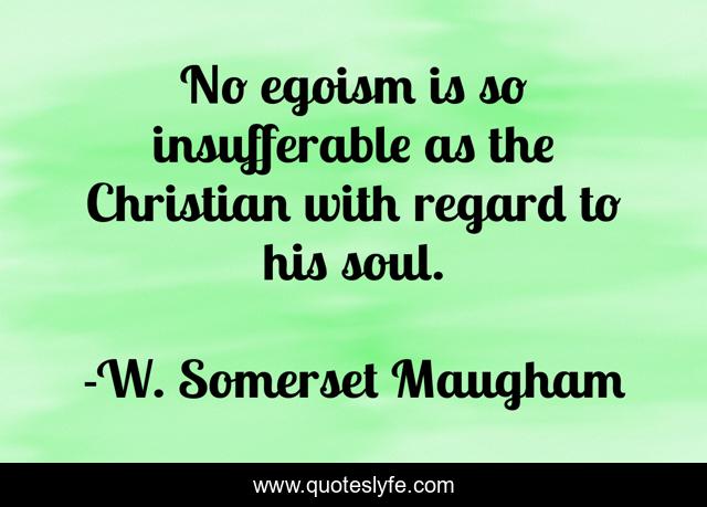 This page presents the quote "No egoism is so insufferable as the Christian with regard to his soul.". Author of this quote is W. Somerset Maugham. This quote is about christianity, egoism, hubris, religion, error, pride, sin, christians,.