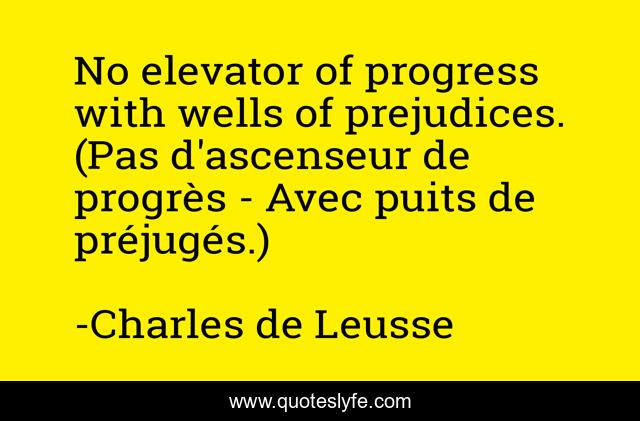 This page presents the quote "No elevator of progress with wells of prejudices. (Pas d'ascenseur de progrès - Avec puits de préjugés.)". Author of this quote is Charles de Leusse. This quote is about ascenceur, puits, well, elevator, préjugés, prejudice, progress, progrès,.